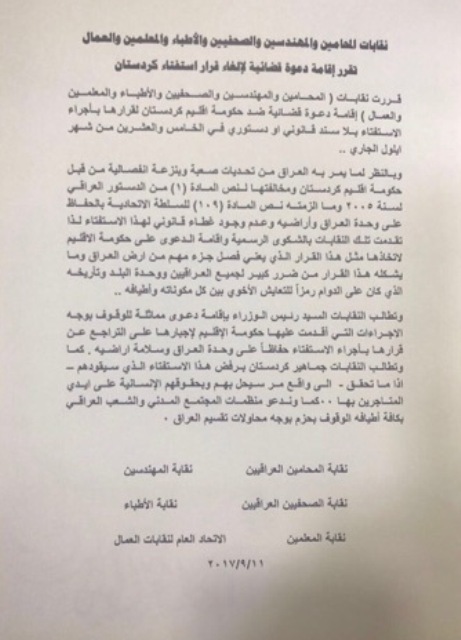 ست نقابات ترفع دعوى قضائية ضد حكومة كردستان لالغاء الاستفتاء