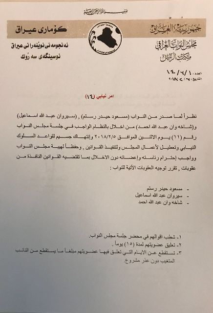 وسيروان عبد الله وشاخه وان عبد الله لمدة 15 يوما، وفيما اشار الى انه سيتم استقطاع الايام التي تعلق فيها عضويتهم، بين انه تم احالتهم الى لجنة تطبيق قواعد السلوك النيابي.