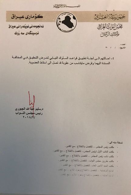 وبينت الوثيقة ان "العقوبات تضمنت شطب اقوالهم من محضر جلسة مجلس النواب، وتعليق عضويتهم لمدة 15 يوما، وتستقطع عن الايام التي تعلق فيها عضويتهم مبلغا ما يستقطع من النائب المتغيب دون عذر مشروع، واحالتهم الى لجنة تطبيق قواعد السلوك النيابي لغرض التحقيق في المخالفة المسندة اليهما ما يتناسب من عقوبة قد تصل الى اسقاط العضوية".