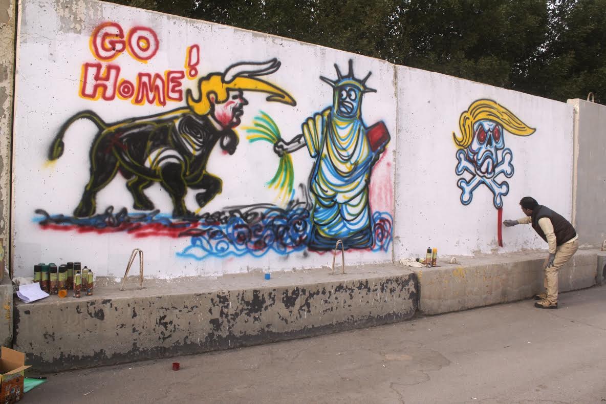 تجسد ترامب بطريقة فنية ساخرة، ومنها رسم يظهر فيه على شكل ثور هائج وبالقرب منه نصب الحرية يظهر مرتعدا من الخوف ويحاول تقديم حزمة من البرسيم ليهدأ من روعه، إضافة الى رسم آخر يظهر فيه ترامب كجمجمة بشرية تستند على خارطة للولايات المتحدة محاطة بأسلاك شائكة".