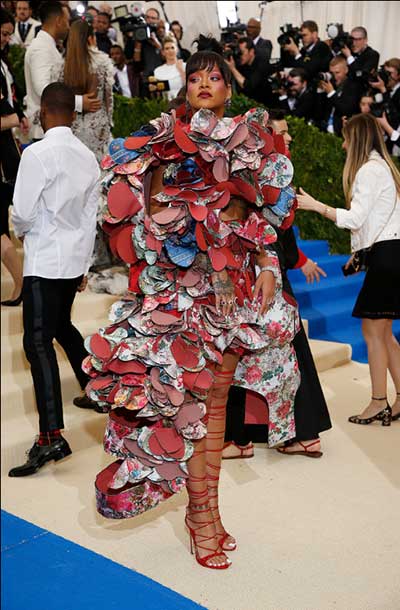 في العام 2015، تمكنت ريهانا كذلك من خطف الأضواء بارتدائها فستانا اصفر مع ذيل طويل جدا من تصميم الصينية غو باي.
