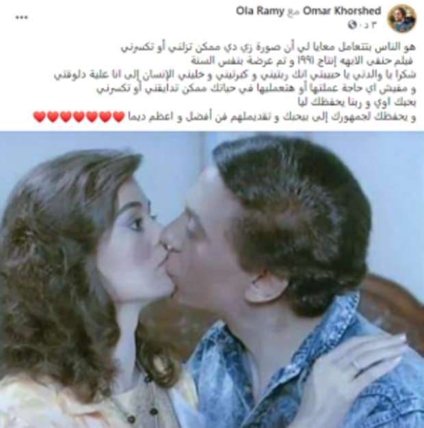 ، قائلا: "مفيش أي حاجة عملتها أو هتعمليها في حياتك ممكن تضايقني أو تكسرني.. بحبك أوي وربنا يحفظك ليا ويحفظك لجمهورك اللى بيحبك وتقدمي لهم فن أفضل وأعظم دايما".