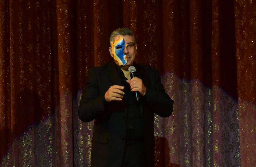 على المسرح وهو يرتدي نصف قناع على وجهه، ليشارك الجمهور بالتجربة الّتي عاشها في الأسابيع الماضية.