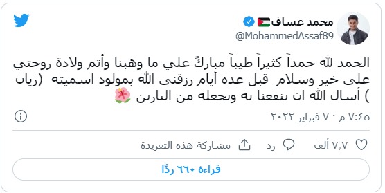 وقال عساف في تغريدة عبر حسابه الشخصي على موقع التواصل الاجتماعي "تويتر": "الحمد لله حمداً كثيراً طيباً مباركاً على ما وهبنا وأتم ولادة زوجتي على خير وسلام".