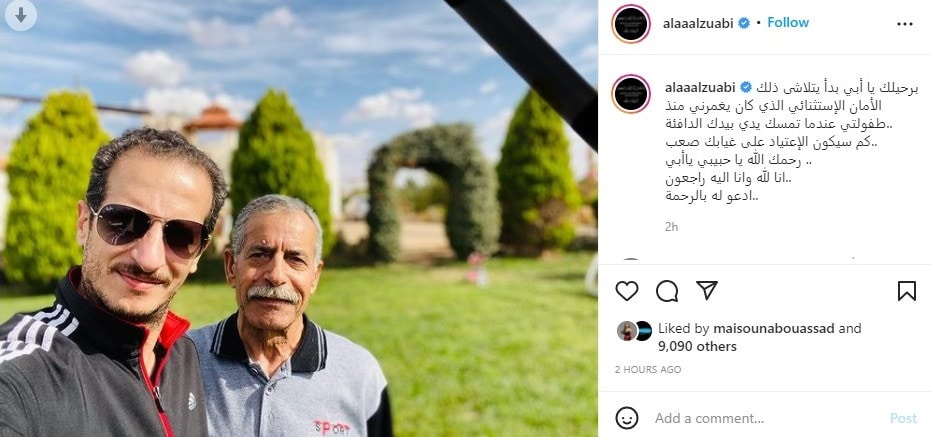 في تعليقه على الصورة: "برحيلك يا أبي بدأ يتلاشى ذلك الأمان الإستثنائي الذي كان يغمرني منذ طفولتي عندما تمسك يدي بيدك الدافئة.. كم سيكون الإعتياد على غيابك صعب.. رحمك الله