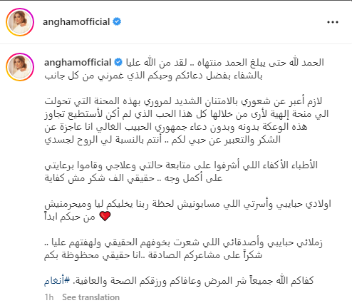وتابعت: "الأطباء الأكفاء الذين أشرفوا على متابعة حالتي وعلاجي وقاموا برعايتي على أكمل وجه.. حقيقة ألف شكر مش كفاية.. أولادي، حبايبي، وأسرتي، إللي مسابونيش لحظة ربنا يخليكم ليَّ وميحرمنيش من حبكم أبدًا".