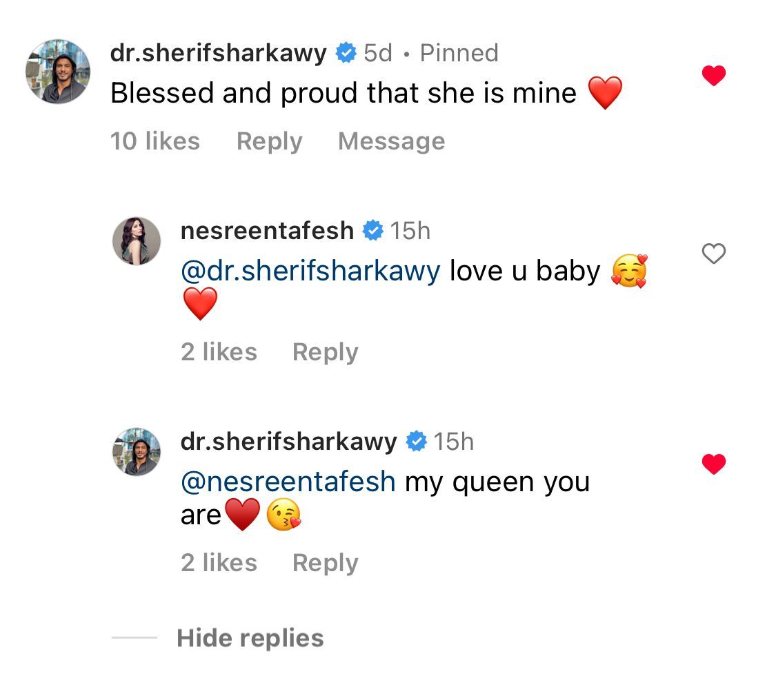 وعلق شرقاوي على منشور لنسرين طافش بموقع إنستغرام قائلا: "سعيد وفخور أن أنتي أنا"، لترد عليه