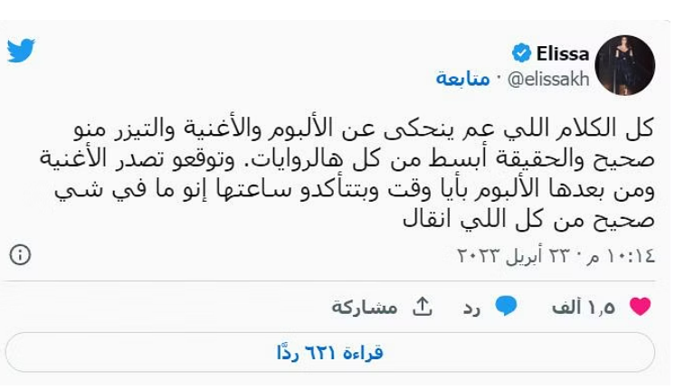 ونفت إليسا وجود أي خلافات من خلال تغريدة على حسابها في "تويتر": "كل الكلام