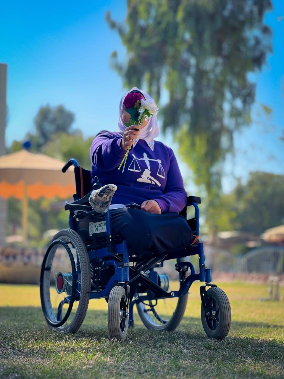 عنها لتبث انها هي وكل ضحايا الإرهاب يستحقون الحياة. وها هي اليوم بعربتها تعلن تخرجها من كلية الحقوق، منتصرةً لذاتها وللمجتمع ولكل من خسر
