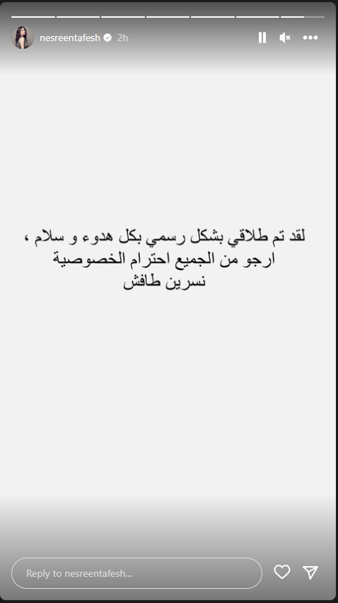 وبعد 6 أشهر من الانفصال عاد الثنائي لبعضهما، وأعلنا ذلك عبر تعليق "نسرين" على صورة "شرقاوي" بكلمات رومنسية، لكنهما سرعان ما انفصلا بشكل مفاجئ، وأعلنت الفنانة ذلك من خلال تدوينة كتبتها عبر "الستوري" قالت فيها: "تم طلاقي بشكل رسمي من شريف شرقاوي.. الرجاء احترام الخصوصية".