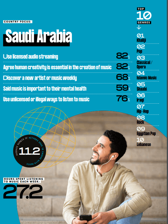 ، والتي جاء الغناء الخليجي في صدارة الأغاني التي يتم الاستماع لها في السعودية، والبوب ثانيا والكلاسك ثالثا والاغانية الإسلامية رابعا والشعبي خامسا والاغاني العراقية في المرتبة السادسة بين اكثر الأغاني استماعا في السعودية.