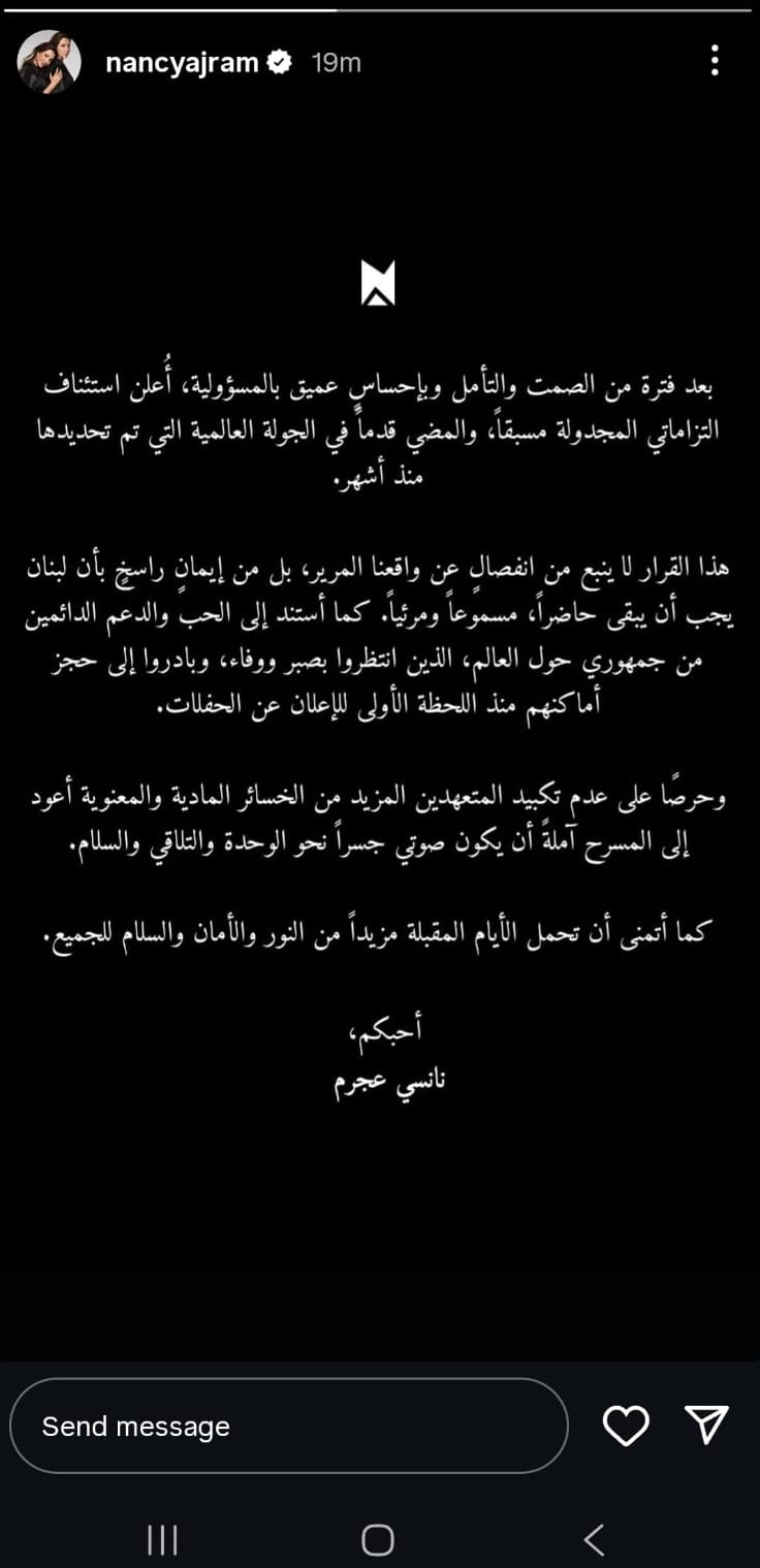 عجرم عبر خاصية "الستوري"على حسابها الرسمي "إنستغرام"، إذ أوضحت أن قرار العودة لم يكن سهلاً، بل جاء بعد فترة من التأمل والشعور بالمسؤولية تجاه جمهورها والمتعهدين الذين التزموا بتنظيم حفلاتها مسبقًا.
