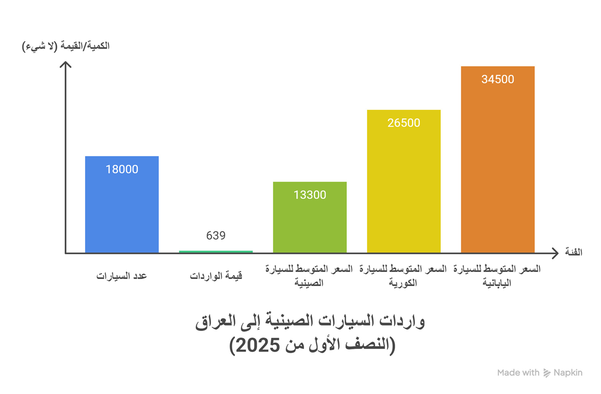 في النصف الأول من عام 2025، استورد العراق حوالي 18,000 سيارة صينية، مقارنة بما يقارب 10,000 سيارة في الفترة نفسها من عام 2024، أي زيادة تقريبية بنحو 80%.