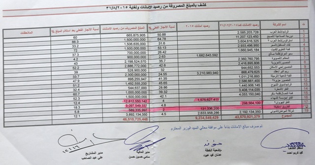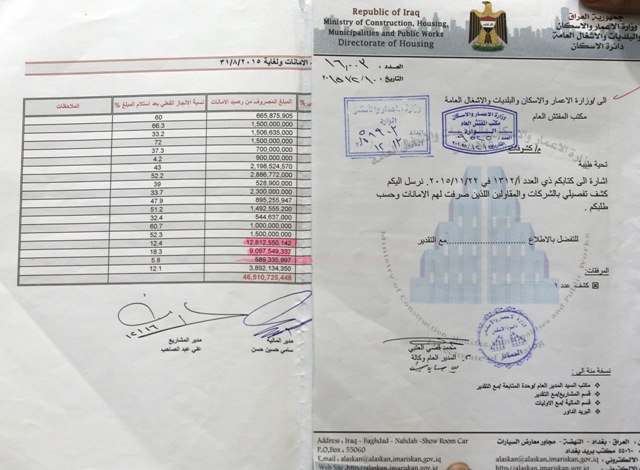 انه "نتيجة الضائقة المالية التي اصابت البلد تم اصدار قرار باسترجاع مبلغ الامانات الخاصة بالمقاولين والبالغة 5% للمقاولين كسلف لاستكمال مشاريعهم"، مبينة ان "وزير الاعمار طارق الخيكاني قام بمنح هذه المبالغ والتي كانت تستقطع منهم تحت اسم حساب الامانات الى بعض الاشخاص دون غيرهم والتي وصلت في بعض الاحيان الى اكثر من 17 مرة من المبلغ الامانة للمقاول".