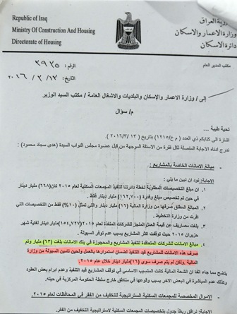 بالوثائق.. الخدمات النيابية تكشف عن وجود شبهات فساد على وزير الاعمار والاسكان