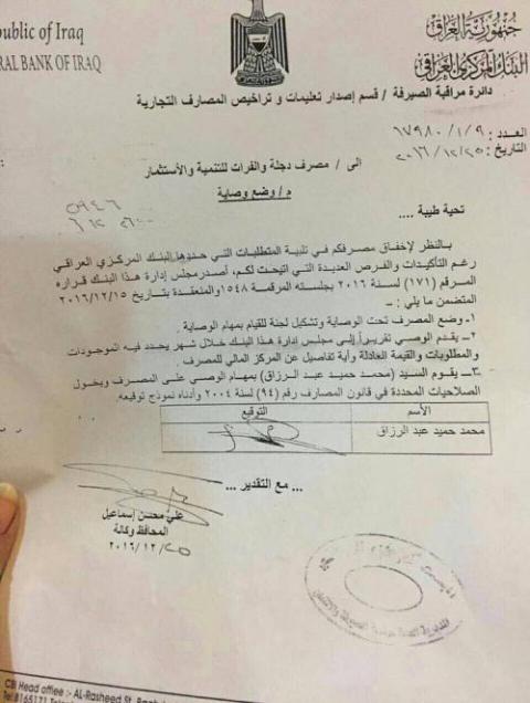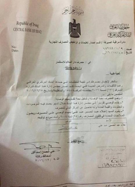 بالوثائق.. المركزي يضع دار السلام ودجلة والفرات تحت الوصاية