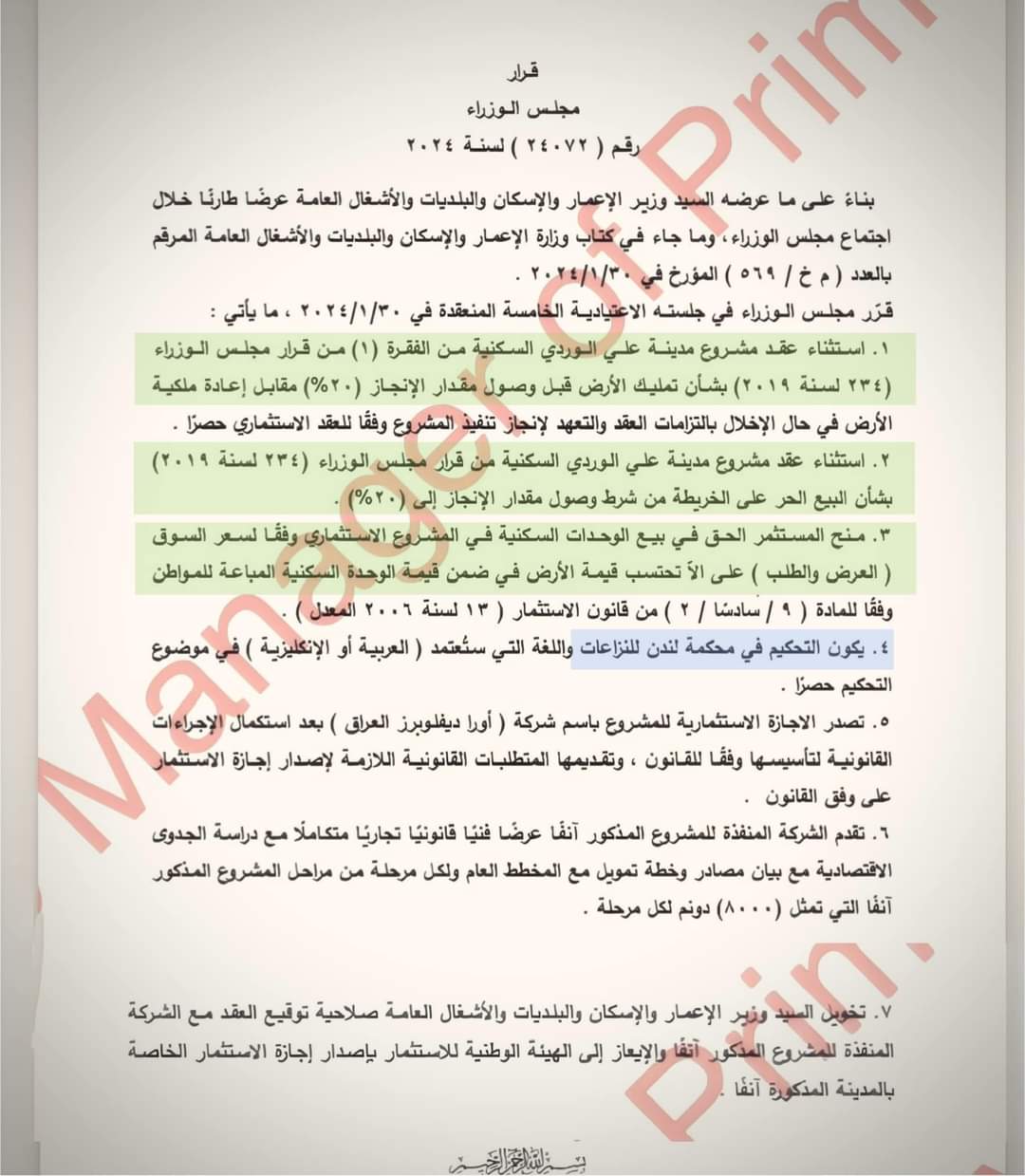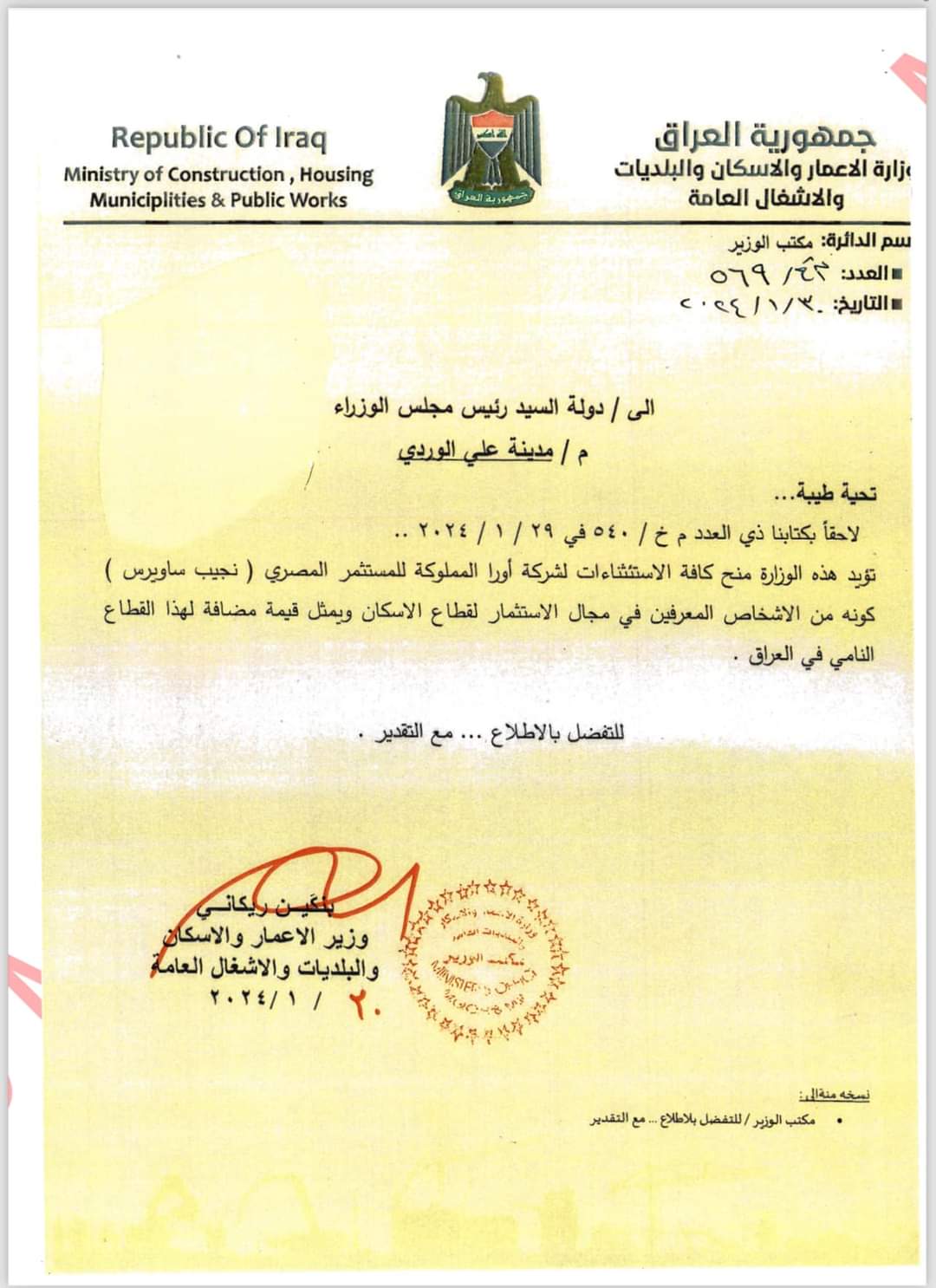 ، وبتوصية وتزكية من وزارة الاعمار والإسكان.