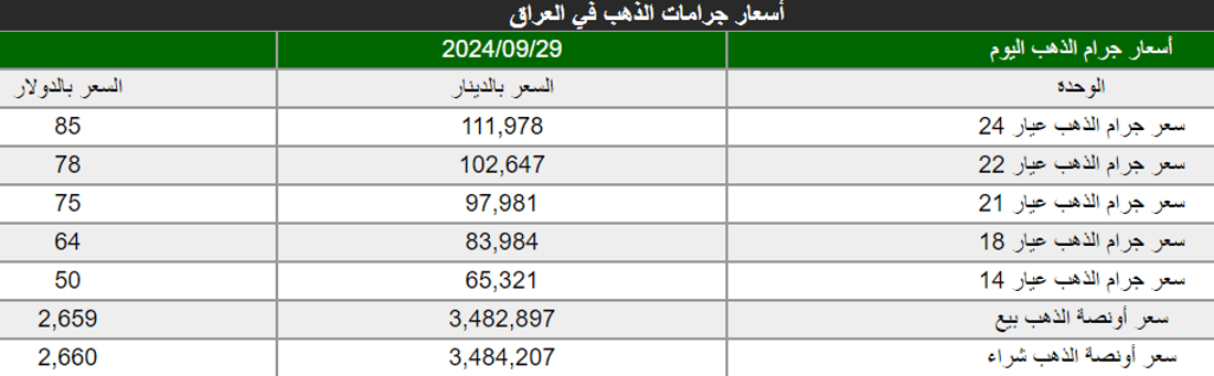 وبحسب موقع "أسعار الذهب"، فإن الأسواق المحلية لهذا اليوم 29 أيلول 2024، سجلت: