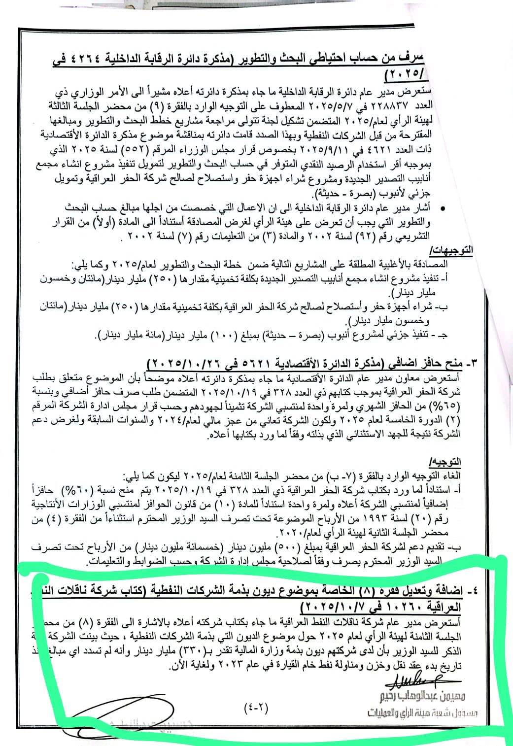 ان الشركة لديها ديون بمثابة أجور نقل بذمة وزارة المالية تبلغ 330 مليار دينار عراقي لم تسدد أي مبالغ منها لصالح شركة الناقلات منذ تاريخ بدء عقد نقل وخزن ومناولة نفط خام القيارة في عام 2023.