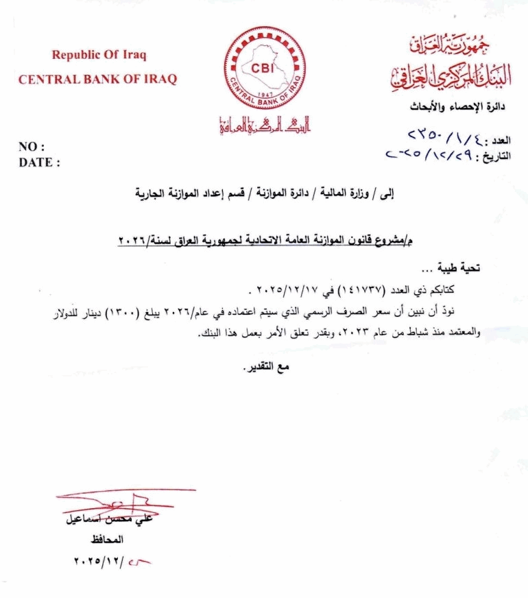 البنك المركزي يخاطب المالية: سعر الصرف سيكون 1300 دينار في موازنة 2026