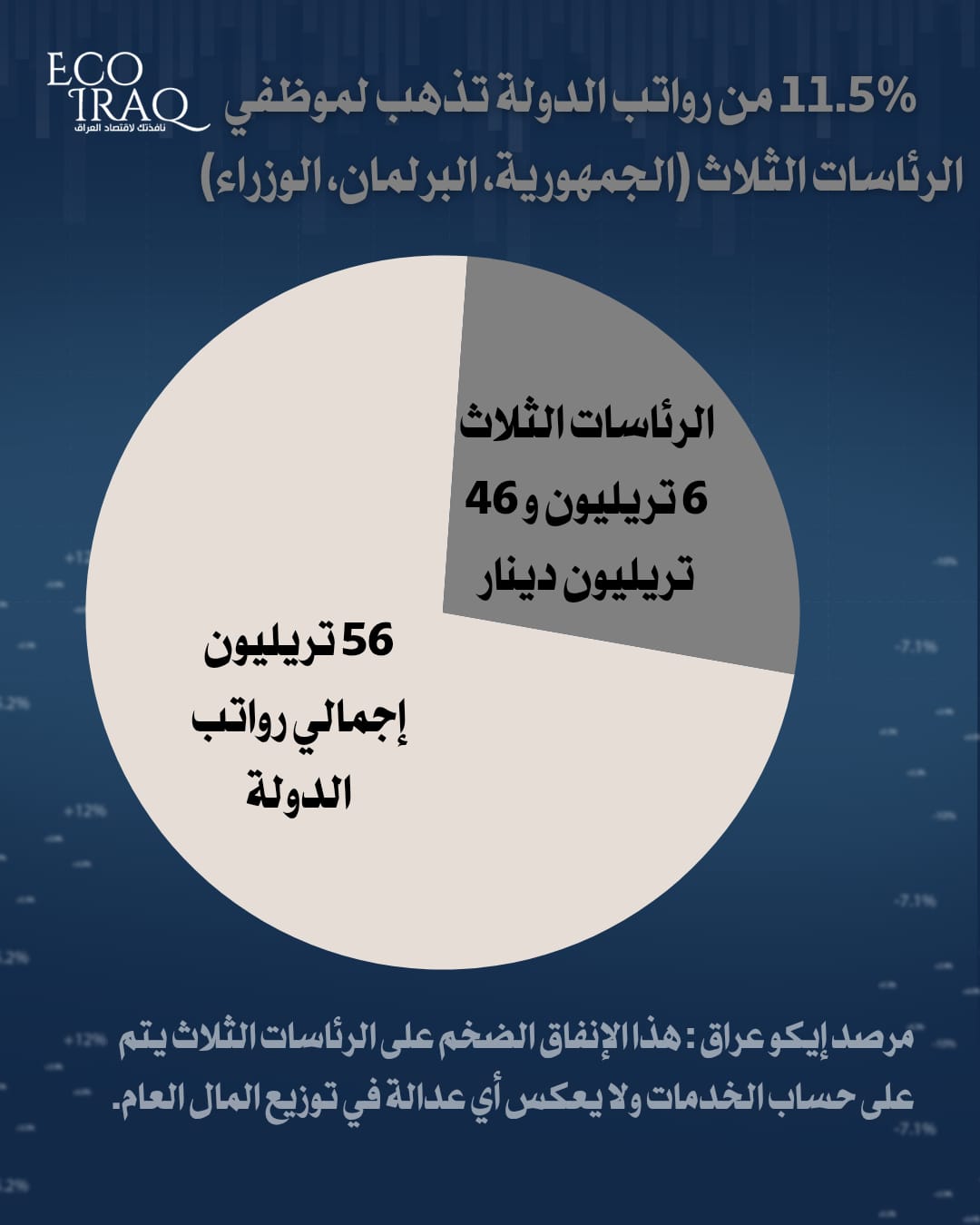 نحو 5.9 تريليون، ومجلس النواب 0.5 تريليون، ورئاسة الجمهورية 0.04 تريليون دينار، ليصل مجموع رواتب الرئاسات الثلاث إلى 6.46 تريليون دينار".