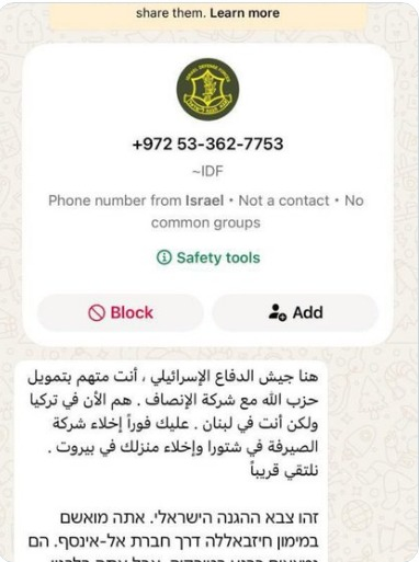 ، إذ وصلت رسائل تهديد مباشرة من قوات الاحتلال الإسرائيلي عبر تطبيق "واتساب"، تتهم بعض هذه الشركات بالتعاون المالي مع "حزب الله"، وسط تقارير تشير إلى أن عدداً من تلك الشركات المهددة يمتلك فروعاً أو شراكات تجارية في السوق العراقية.