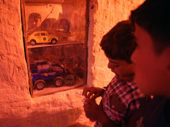 يلعب عبد العزيز مع أصدقائه في هذا النفق الترابي الذي يشكل جزءًا من معلب تحت الأرض، حيث يكون الأطفال في أمان بعيدًا عن القصف المتواصل لقوات