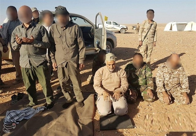 وهو يصلي على الحدود العراقية السورية وإلى جانبه عدد من عناصر لواء "فاطميون" الأفغاني.