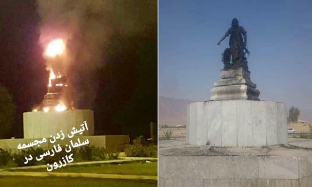 بالصور.. ايرانيون يضرمون النار في تمثال الصحابي سلمان الفارسي