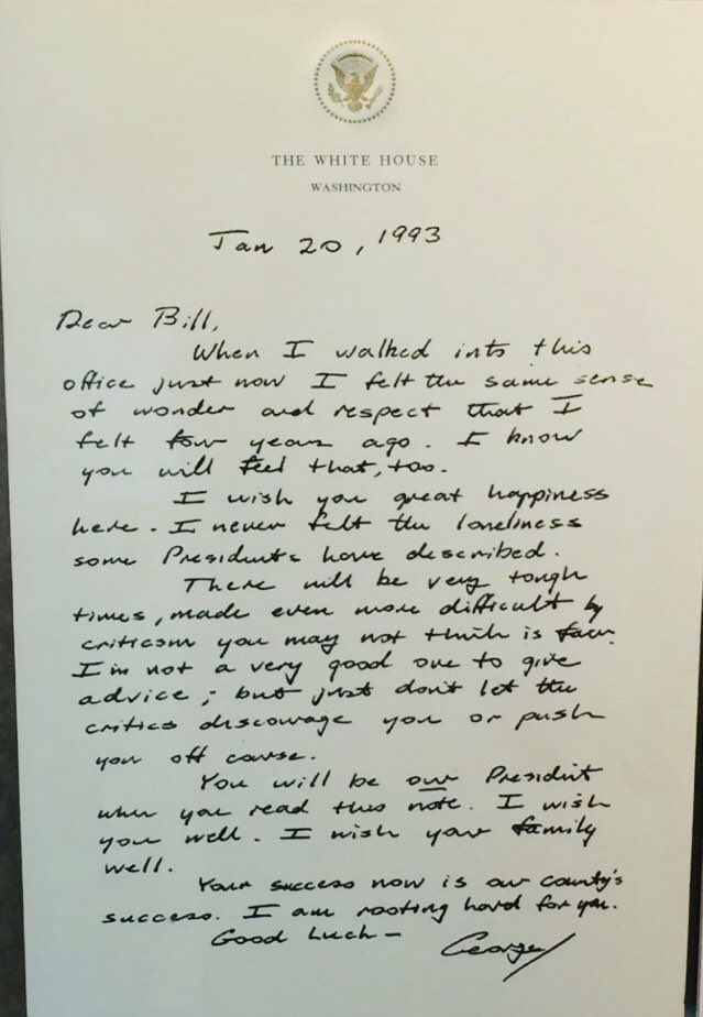 عزيزي بيل عندما دخلت إلى هذا المكتب، شعرت بنفس شعورك الآن وهو الدهشة والاحترام مثلما شعرت به منذ أربع سنوات. أعلم أنك ستشعر بذلك أيضاً. وأضاف بوش أتمنى لك السعادة الكبيرة في هذا المكان. لم أشعر قط بالوحدة التي وصفها الرؤساء.