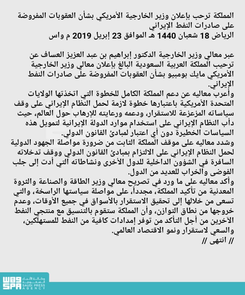 السعودية ترحب بالقرار الأميركي بوقف الإعفاءات للدول المستوردة للنفط الإيراني