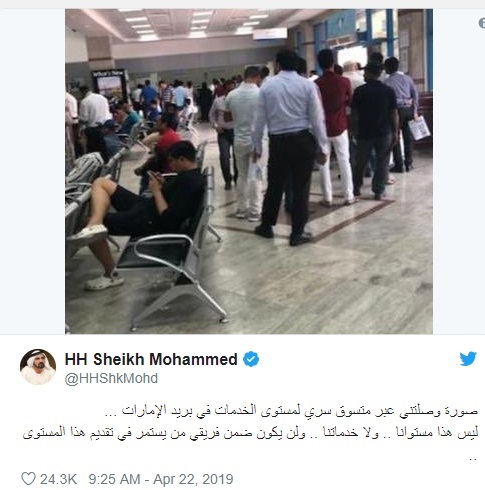 "أرسلنا فريقا للتحقق من مستوى خدمات بريد الإمارات في أحد مراكزهم.. عاد الفريق بهذا التقرير.. أضعه أمام الجميع بكل شفافية.. وأقول لجميع من في الحكومة.. لن يمر شيء دون متابعة بكل شفافية".