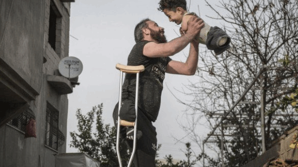 فازت صورة مؤلمة لأب سوري بساق واحدة ويحمل طفله المولود بدون أطراف سفلية أو علوية بصورة العام لجوائز