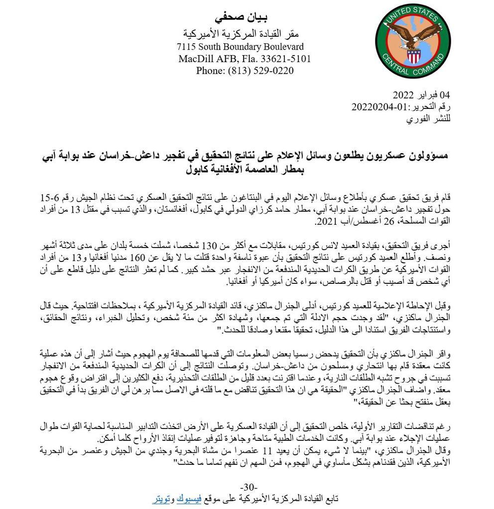 الأميركية، اليوم الجمعة، بياناً حول نتائج التحقيق العسكري في تفجير "داعش-خراسان" عند
