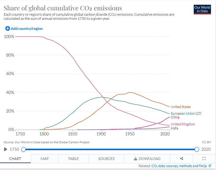 تبين الإحصائيات الأخيرة الصادرة عن أطلس الكربون العالمي لعام 2020، أن هنالك تبايناً كبيراً بين الدول الأعلى إطلاقاً لثاني أكسيد الكربون عبر التاريخ وبين الدول الأعلى حالياً، ولكن يركّز النشطاء والمعنيّون على الدول المتسببة بالنسب الأعلى تاريخياً لأن جزءاً كبيراً من ثاني أكسيد الكربون يبقى في الغلاف الجوي لمئات السنين بمجرد انبعاثه، ولا يعني انخفاض مساهمتهم الحديثة في الانبعاثات انزياح المساءلة عنهم وفقاً للنشطاء.