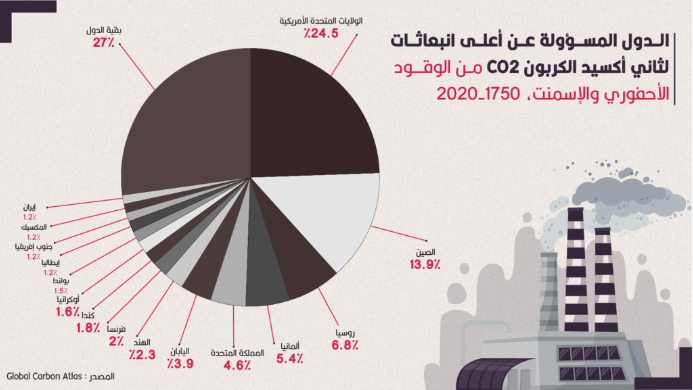 لمعرفة الدول التي ساهمت بالحصّة الأكبر في التأثيرات المناخية، يمكن العودة لمشروع أطلس الكربون العالمي (Global Carbon Atlas) الذي يغطّي مستويات انبعاثات ثاني أكسيد الكربون الناتجة على صعيدٍ سنويّ وتراكميّ، لا سيما أنه المحرّك الرئيسي لما نشهده من التغير المناخي.