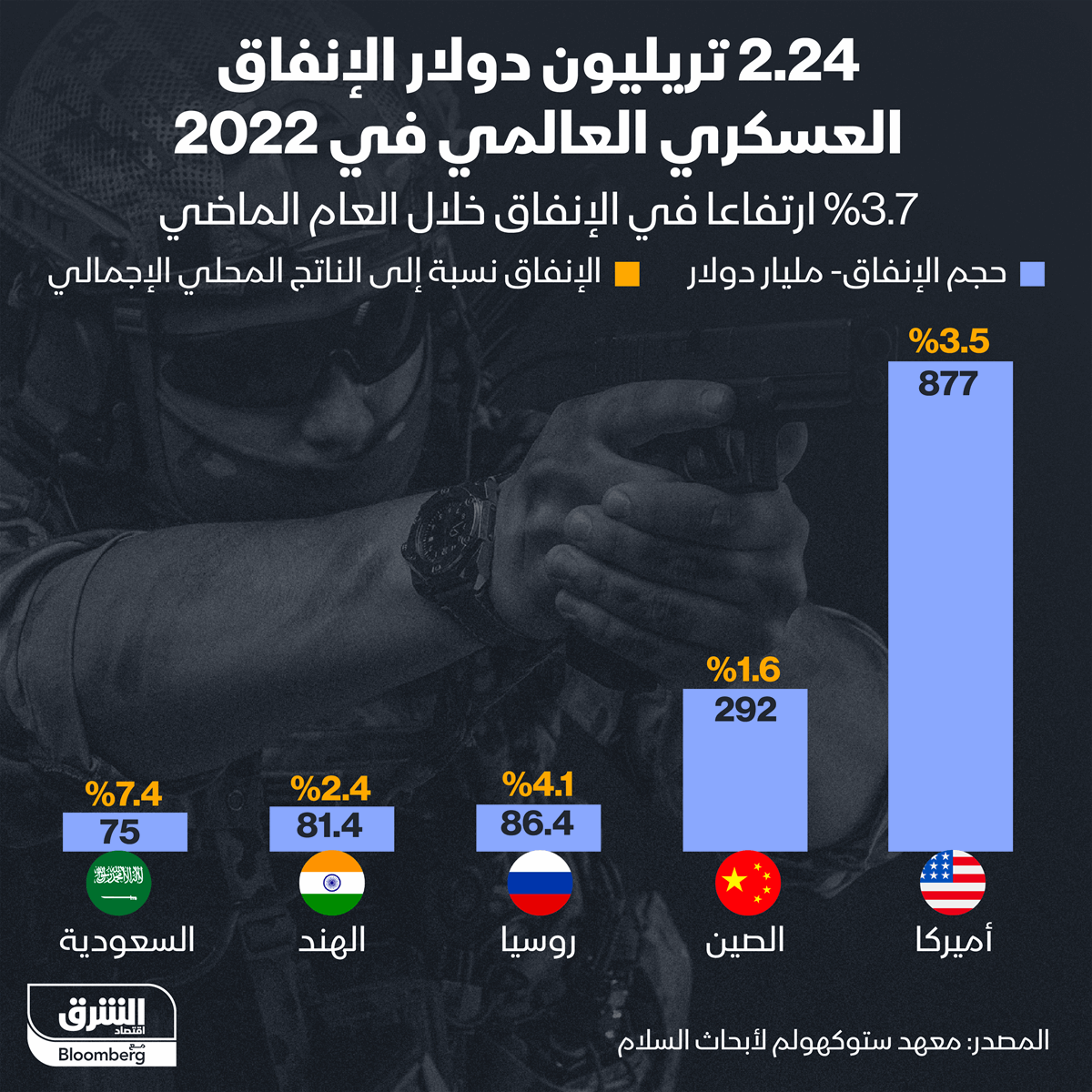 بلغ إجمالي الإنفاق العسكري العالمي نحو 2.2 تريليون دولار خلال العام الماضي 2022، بنسبة ارتفاع بلغت 3.7% مقارنة بالعام 2021. وفقاً لمعهد ستوكهولم الدولي لأبحاث السلام (سيبري)