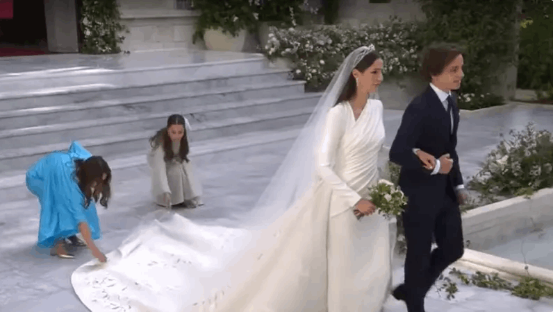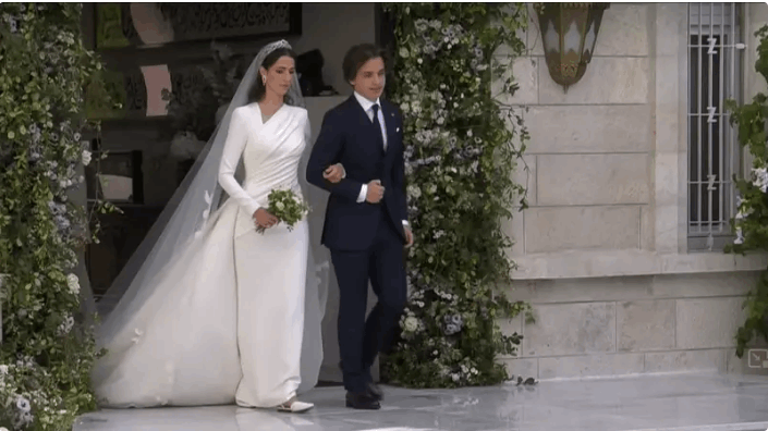 وظهرت شقيقتا ولي العهد، الأميرة إيمان والأميرة سلمى تقفان خلف العروس رجوة تساعدانها في ترتيب الفستان، وتعديل وضعيته خلال مسيرها.