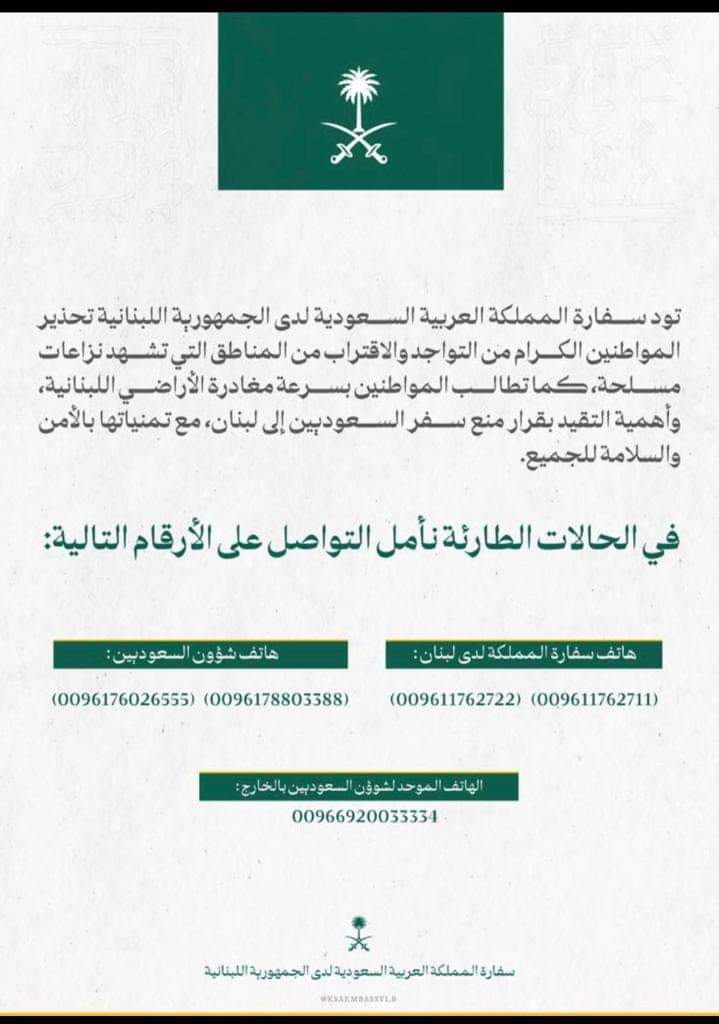 وأضافت: "كما تطالب المواطنين بسرعة مغادرة الأراضي اللبنانية واهمية التقيد بقرار منع سفر السعوديين الى