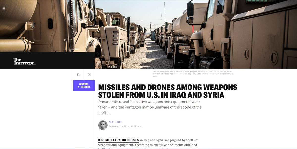 ويأتي ذلك بعد مئات الآلاف من الدولارات من المعدات العسكرية التي تم سرقتها من القوات الأمريكية في العراق وسوريا بين عامي 2020 و2022، كما أفاد موقع The Intercept في وقت سابق من هذا العام.