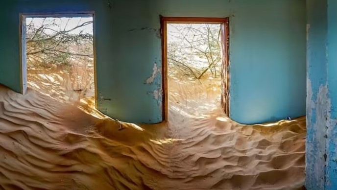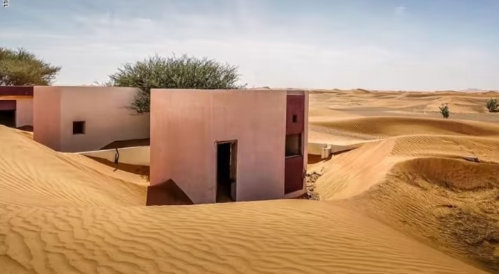 ولا تزال أطلال المنازل القديمة مرئية باستثناء بعض المنازل التي غرقت بالكامل في بحر من الرمال، والتي تدفقت عبر النوافذ، وغمرت الساحات وقطع الأثاث.