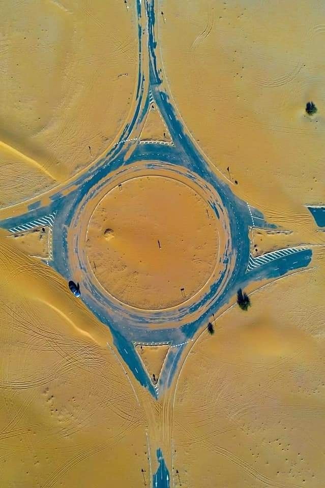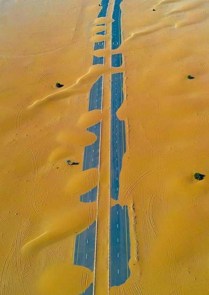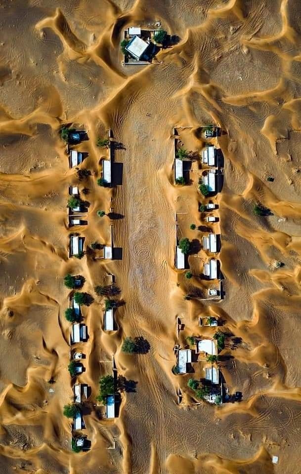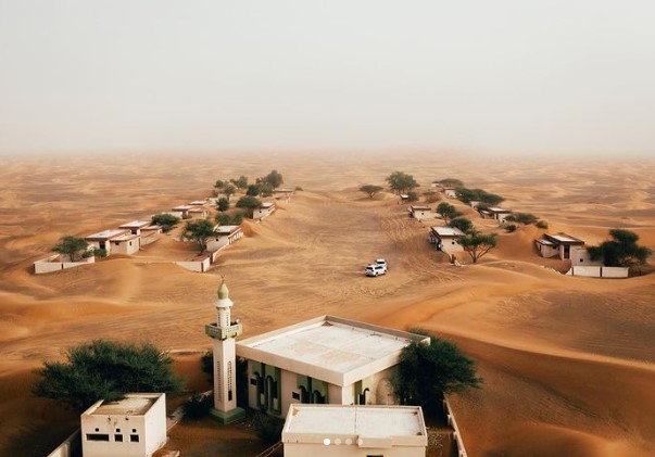 تظهر صور جوية قرية غير مأهولة تحمل اسم "المدام" على بعد ساعة بالسيارة من مدينة دبي في الإمارات العربية المتحدة، مع منازل مغطاة بالصحراء.