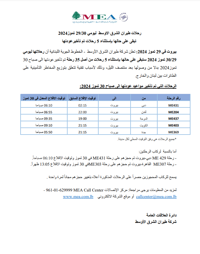 ان رحلاتها ليومي 29 و 30 تموز 2024 ستبقى على حالها باستثناء 5 رحلات من اصل 35 رحلة تم تأخير عودتها الى صباح 30 تموز 2024 بدلا من وصولها بعد
