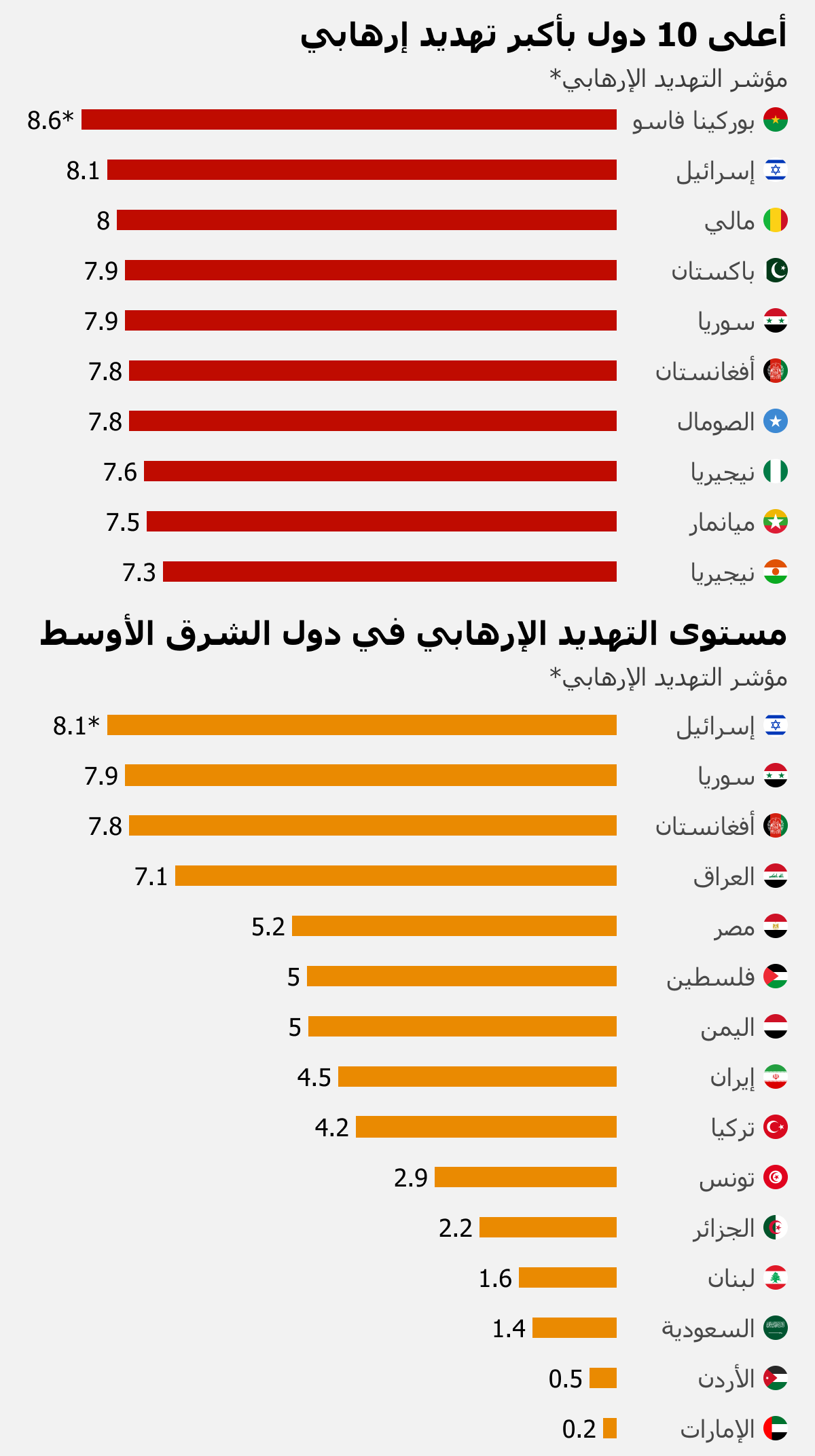 وتوضح الإحصائية ادناه مستوى التهديد الإرهابي في دول العالم وفي منطقة الشرق الأوسط وشمال أفريقيا.