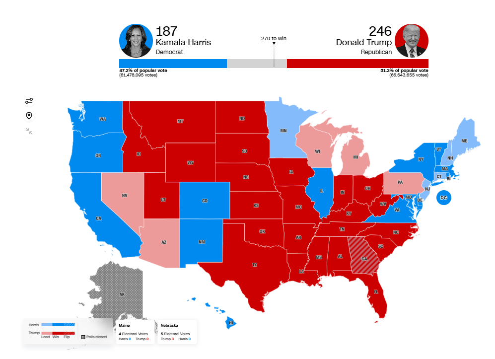 على 187 صوتا، من اصل 270 صوتا يجب ان يحصل عليها المرشح من المجمع الانتخابي ليفوز بالرئاسة، ما يعني انه لا يفصل ترامب سوى 24 صوتا ليفوز بالرئاسة رسميا، وهو الامر المتوقع.