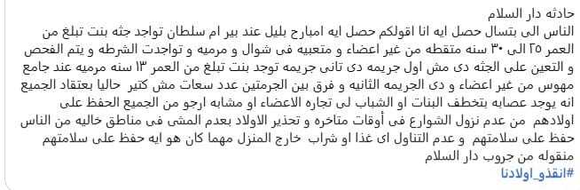 المنشور المثير للجدل، روّج لوجود عصابة متخصصة في خطف الشباب والفتيات بهدف الاتجار في الأعضاء البشرية، ودعت مروجته، إلى عدم خروج الشباب والفتيات ليلًا حفاظًا على سلامتهم.