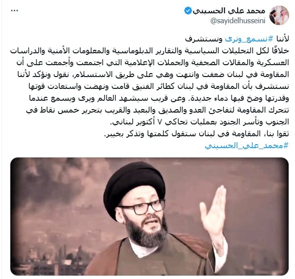 وعن قريب سيشهد العالم ويرى ويسمع عندما تتحرك المقاومة لتفاجئ العدو والصديق والبعيد والقريب بتحرير خمس نقاط في الجنوب وتأسر الجنود بعمليات تحاكي ٧ أكتوبر لبناني.