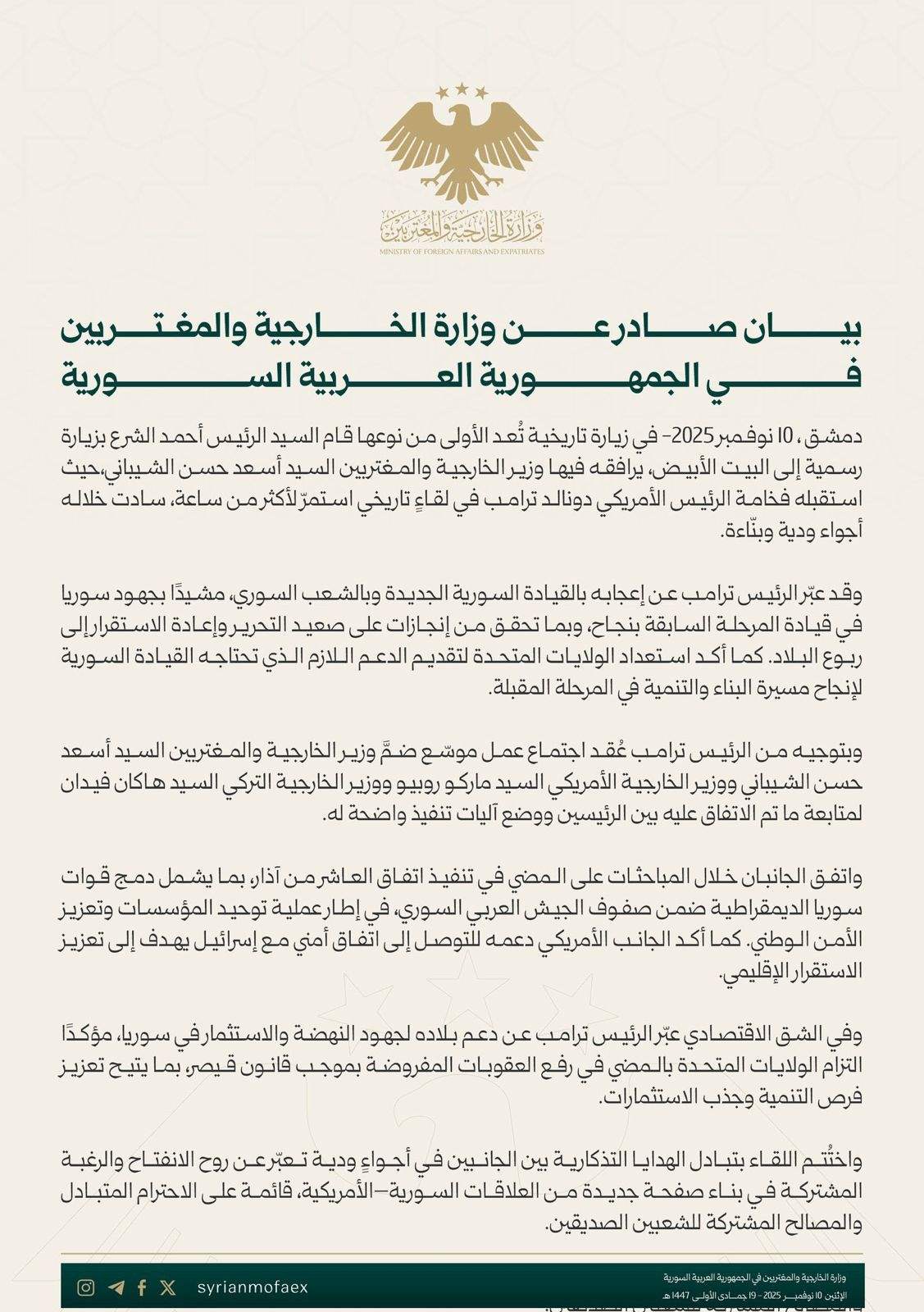 تعليق سوري جديد يخص زيارة الشرع الى واشنطن