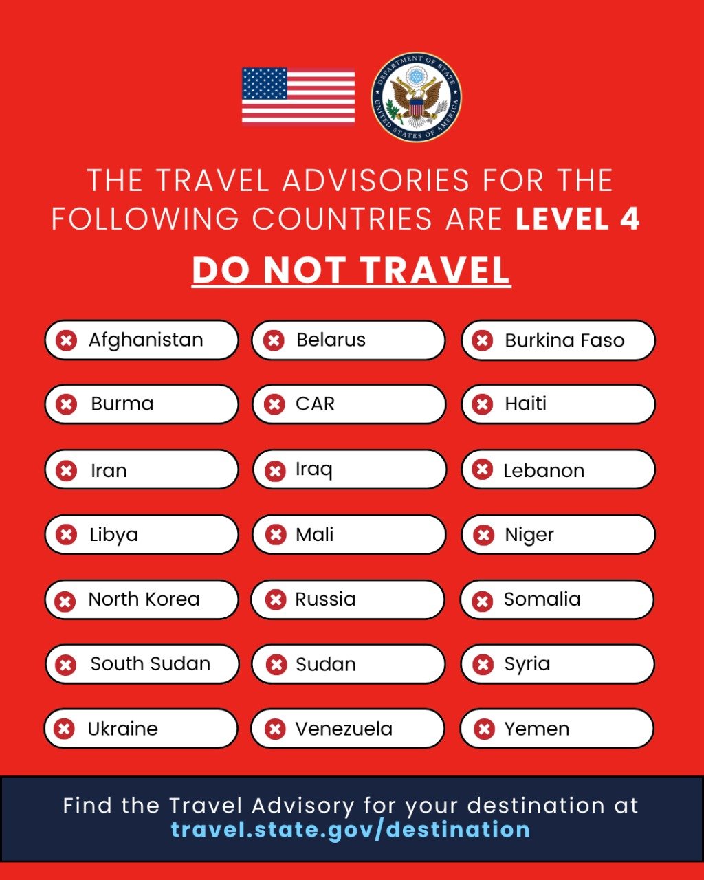 أصدرت دائرة شؤون القنصلية بوزارة الخارجية الأمريكية، تحذيرات من السفر الى 21 دولة بينها