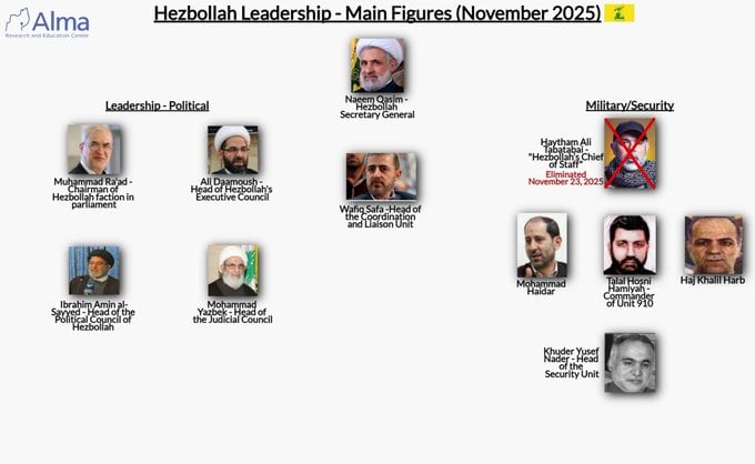 نشر مركز "ألما" الإسرائيلي للأبحاث قائمة شملت عددا من القياديين البارزين في "حزب الله" بينهم الأمين العام للحزب الشيخ